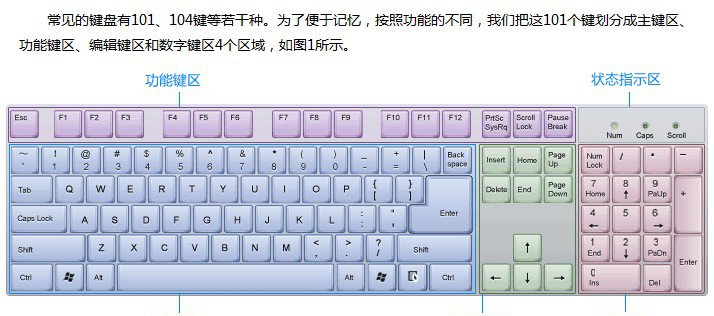 常见的键盘有101,104键等若干种,为了便于记忆,按照功能的不同,我们把这101个键划分成主键区,功能键区,控制键区,数字键区,状态指示区。下面是电脑键盘功能的各个键区示意图以及简介。赶紧和小编一起来看看吧!...